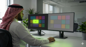 تجربة مستخدم سعودي (UX Writer) يعمل بتركيز لصياغة رسالة توجه المستخدم